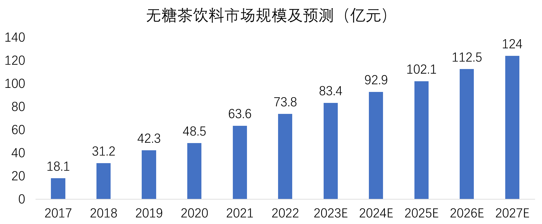 我國(guó)無糖茶飲料自2017年以來持續(xù)保持增長(zhǎng)趨勢(shì),2017年到2022年,市場(chǎng)規(guī)模從18.1億元增長(zhǎng)至73.8億元,預(yù)計(jì)2023年會(huì)達(dá)到83.4億元。線上銷售額從2018年的4679.5萬(wàn)元增長(zhǎng)至2022年的44730.7萬(wàn)元,五年時(shí)間翻了近10倍。